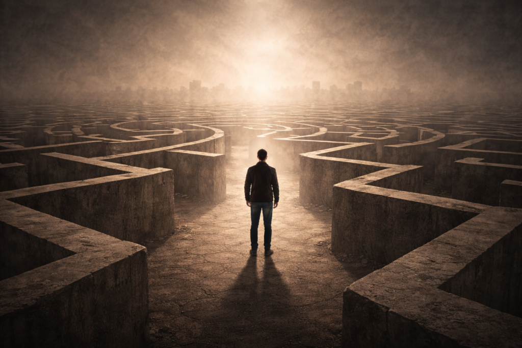 Sem essência, sem valores absolutos, sem garantias metafísicas, a liberdade não aponta caminhos. Ela não orienta. Ela exige decisão. É por isso que a liberdade existencial se parece menos com um campo aberto e mais com um labirinto. Cada passo fecha possibilidades. Cada escolha cria um caminho irreversível.